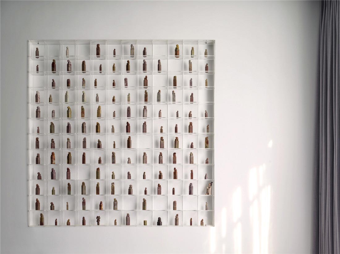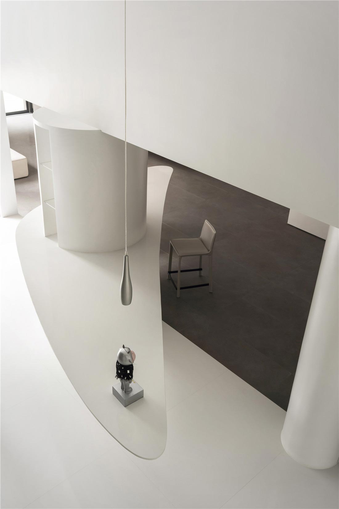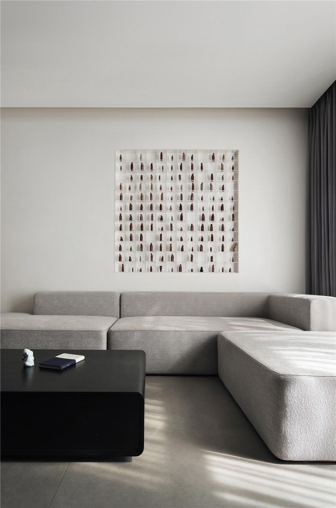 /“背有靠山”,依山而坐,沙发背景墙让前行也多了几分笃定。亚克力透明的展示柜,来自世界各地的手办与雕塑,生活的趣味在此开启。大厅地面用砖:素水泥 | SFT12605MP原石面产品。