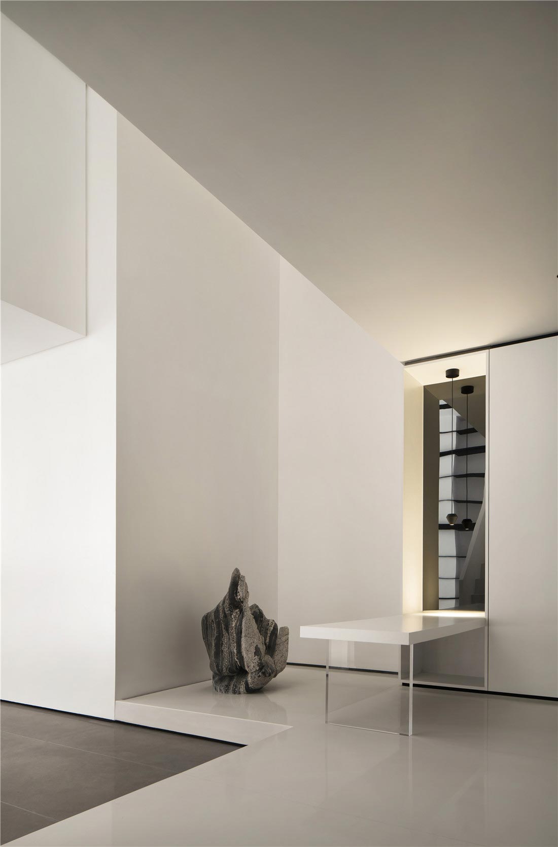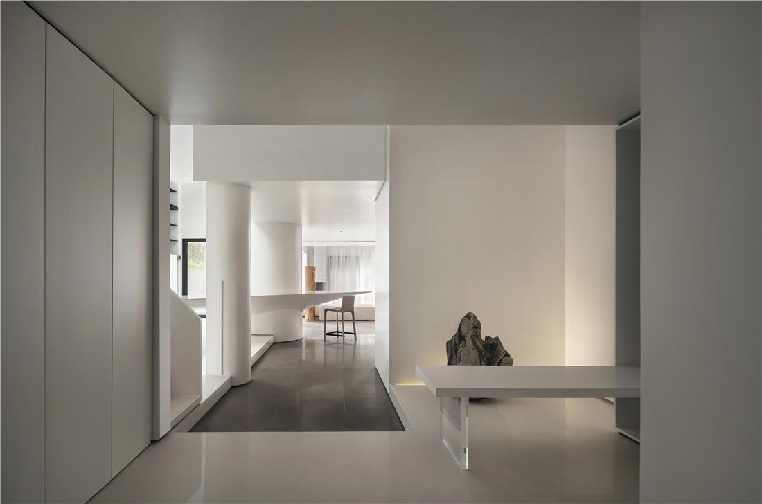 /玄关处自然风化的石头让“开门见山”的景象回家既视;望向软膜天花,整个身心瞬时变得自在从容。