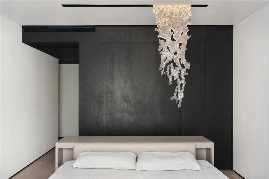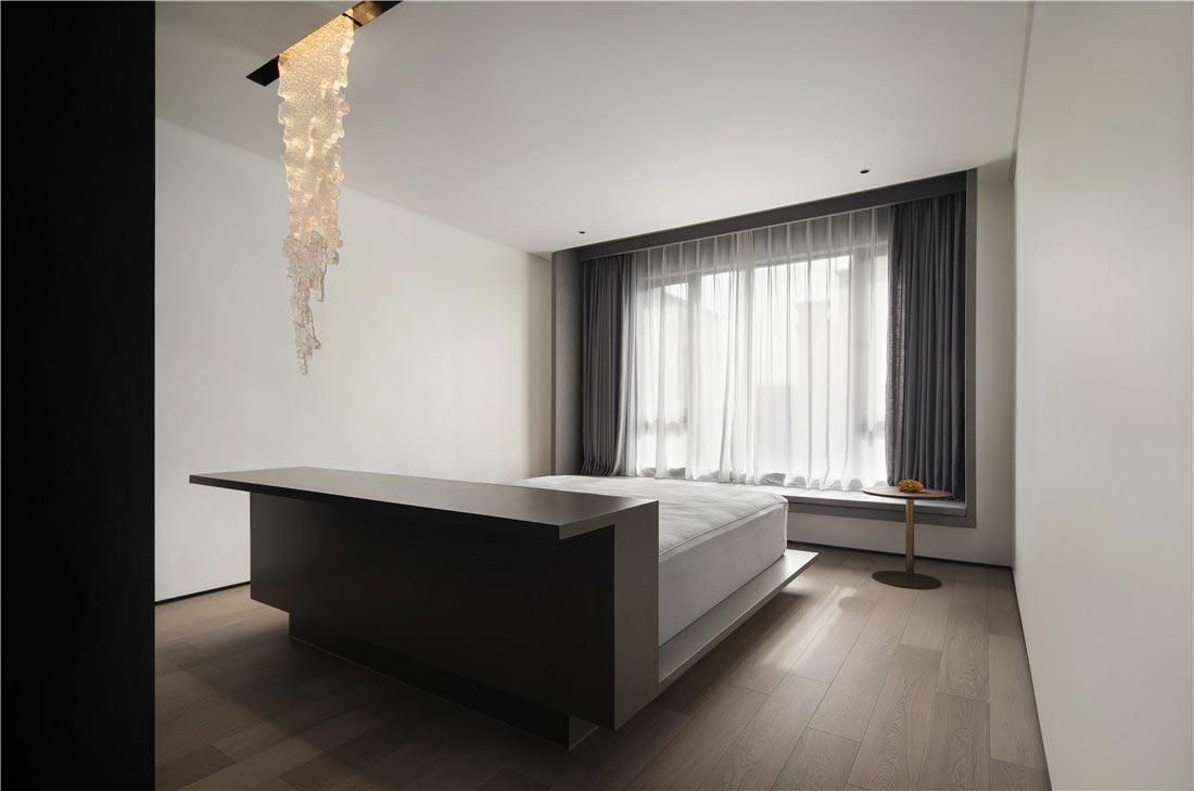 /环岛式设计的主人房,把床与书桌合拼为一体,亚克力流水状吊灯倾流而下,为整个卧室注入丝丝清韵。