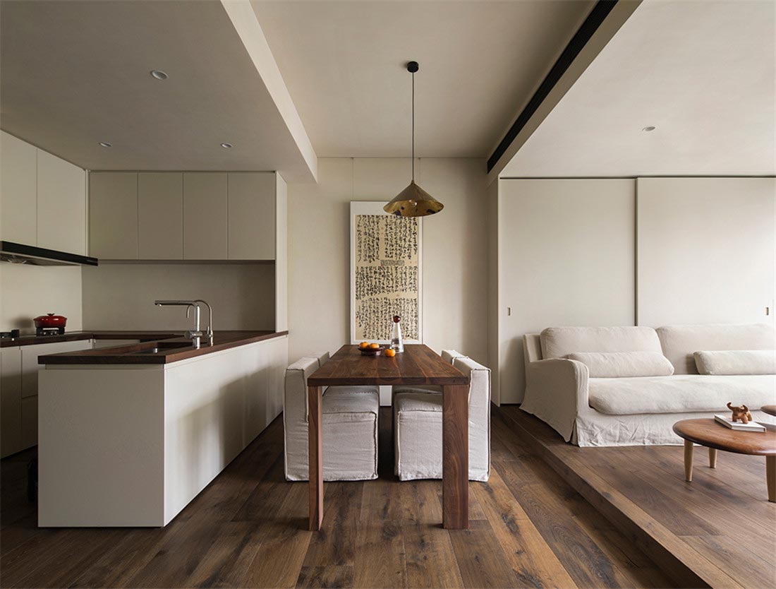 从客厅开始,我们就注意到屋主对家装和家具选择都有朴素的风格的偏好。被胡桃木包裹着的走廊,阳光透过百叶窗帘,光影摇曳,定格温暖。一幅日本回流草书茶挂,恒守对温、诗、意的向往,在日常感知自然、艺术、美学的浸润。