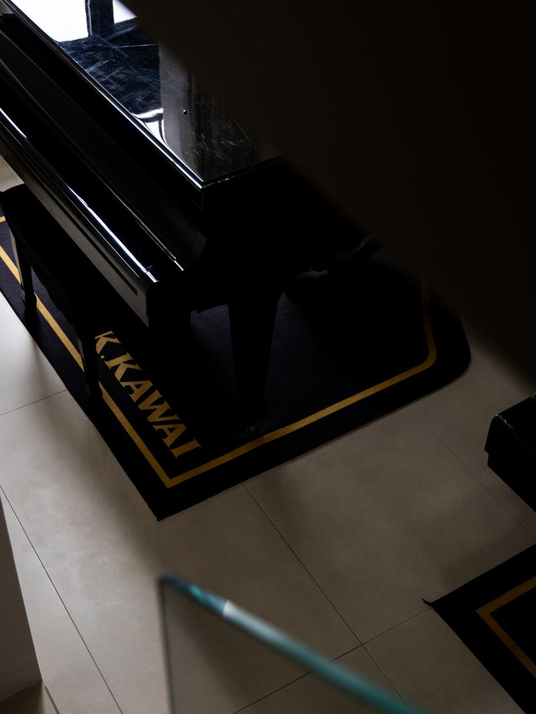 书架的摆设延伸至二楼,如同为立式钢琴打造装饰性的壁。钢琴在丰富多彩的黑白色氛围装饰中看起来像找到了自己的归宿一样,无处不散发典雅气质。
