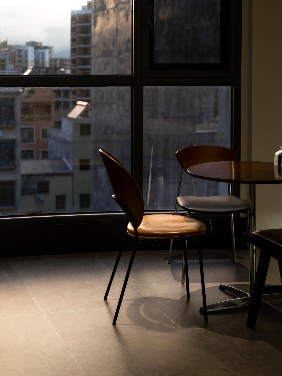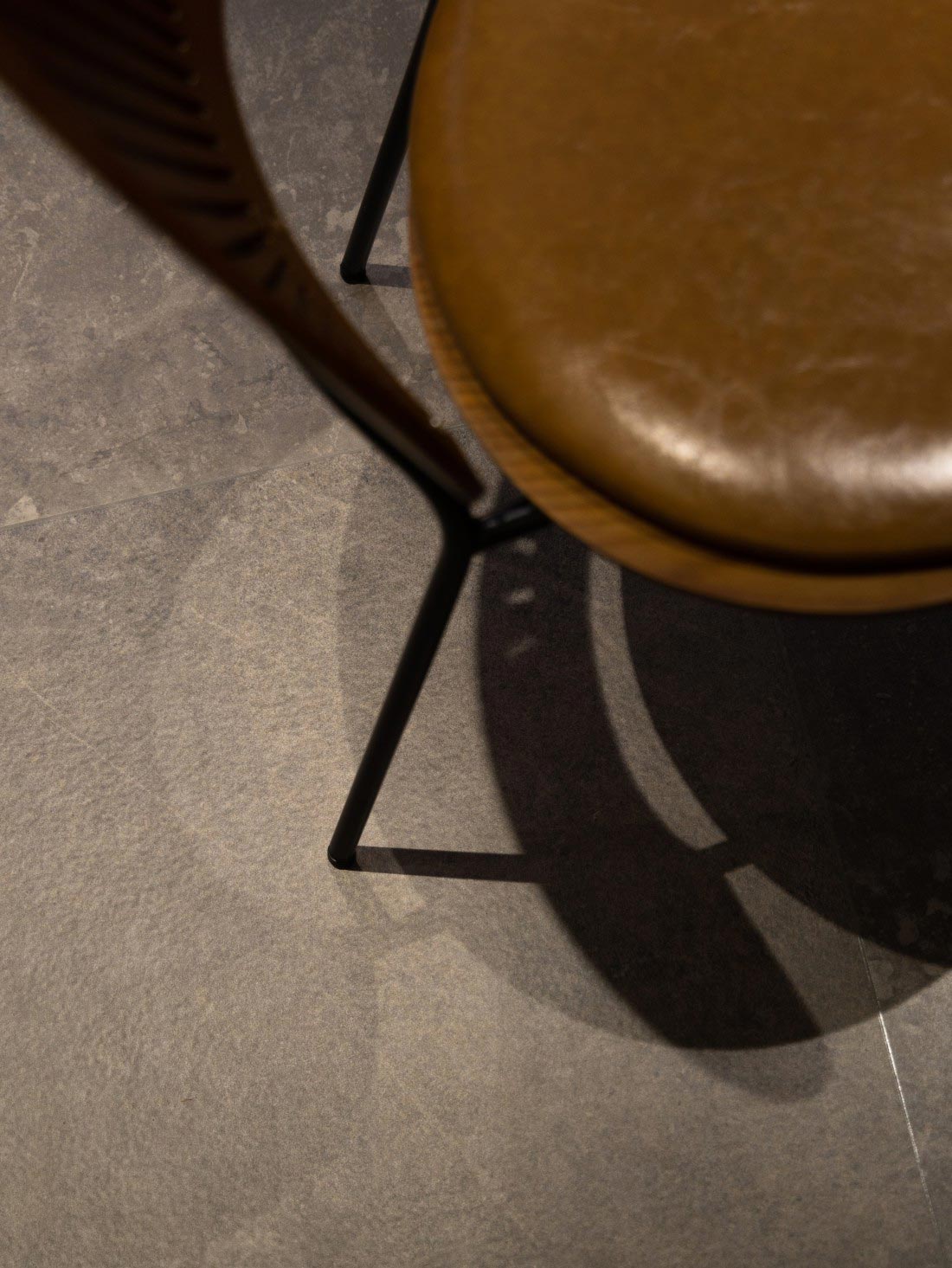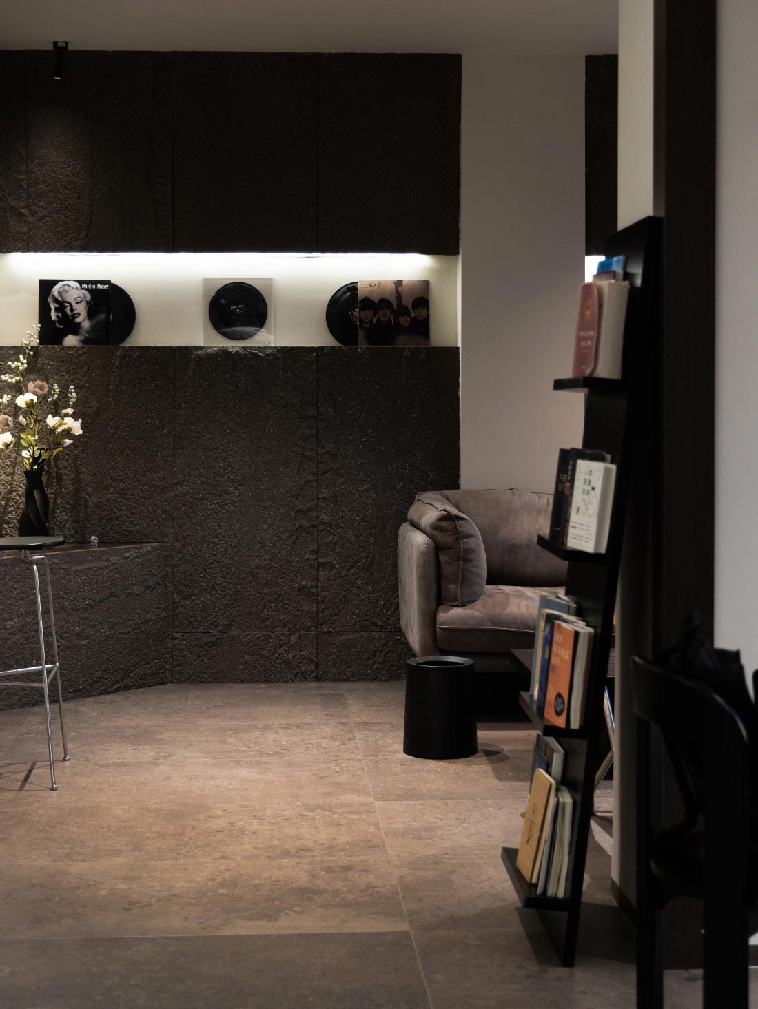 瓷砖选用质感细腻变化的SRD12607(阖石系列/褐灰色)大面积铺陈;木质、牛皮、金属与不同形状的装置摆设相互协调,让颜色和光线温度都停留在刚好的位置。