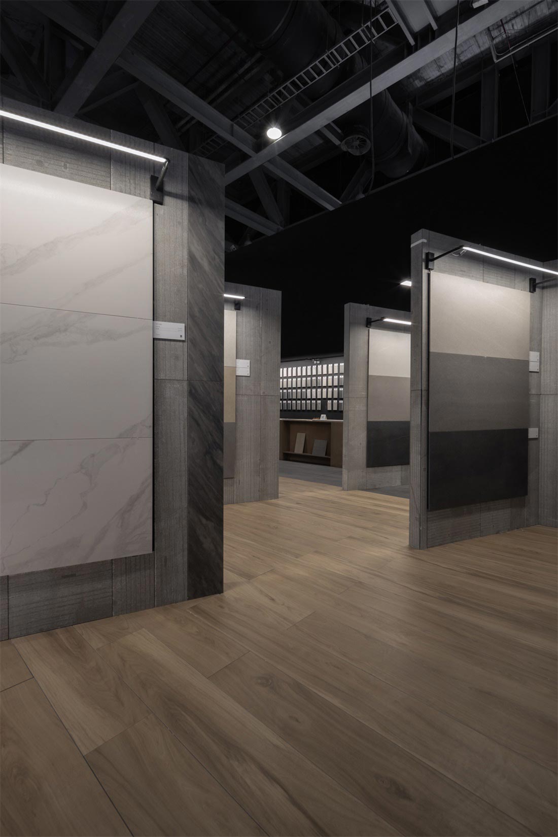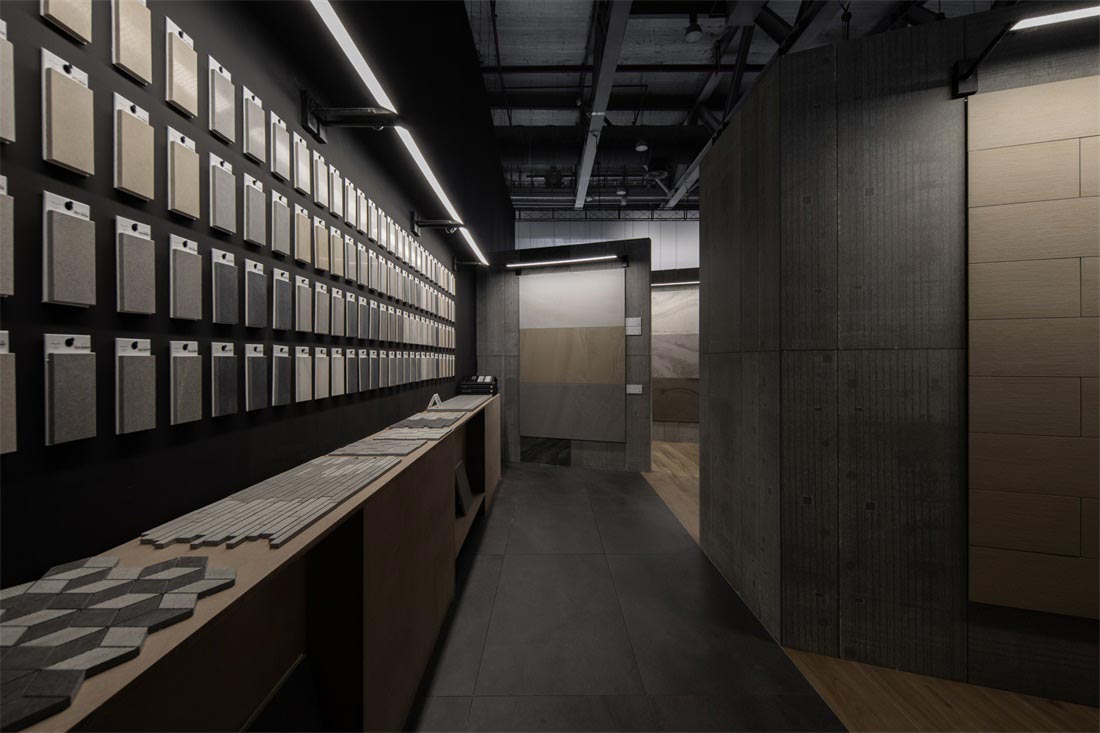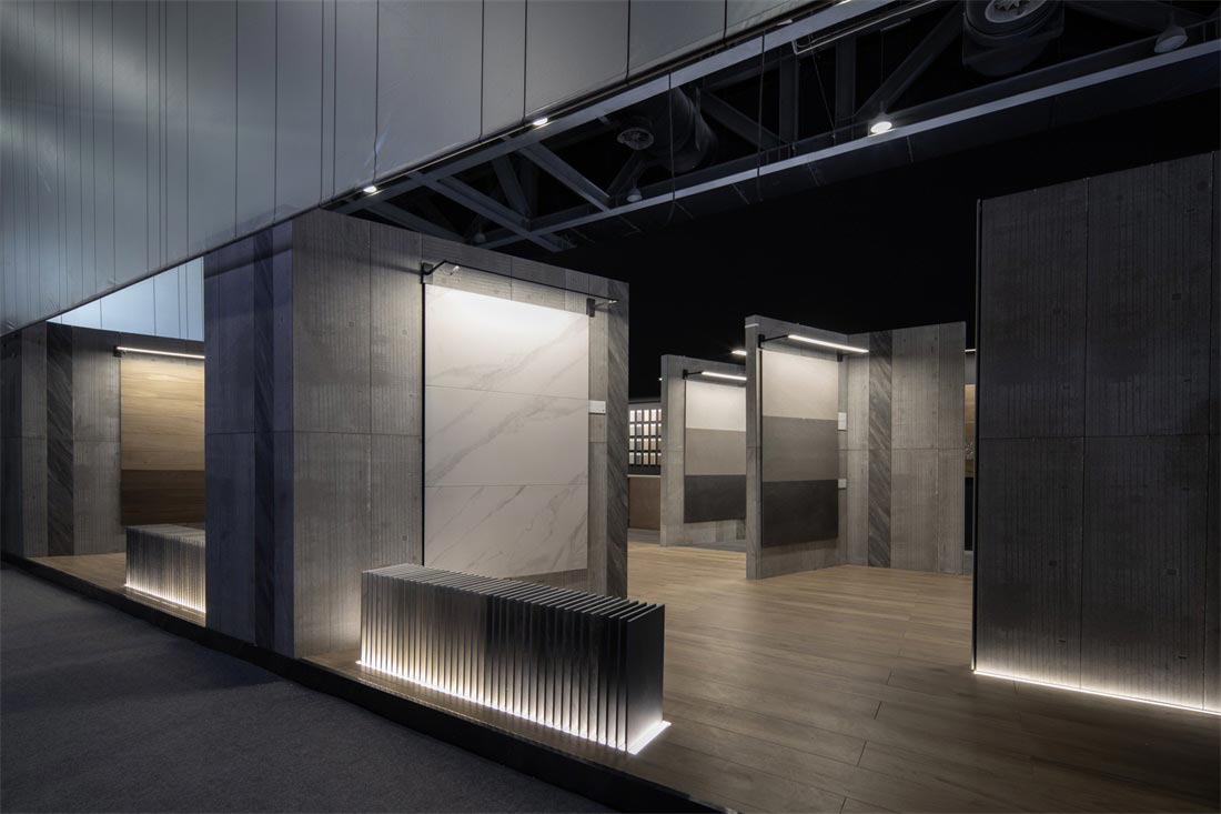 砖背为空间墙体装饰面,砖正面铺贴在墙体,肌理为点缀,形成了整个展位设计的视觉基调,不同的材质肌理细节在空间中放大,于宽敞空间中自然延伸,极尽视野开阔的享受。而细微之处传递出充满爱与热忱的氛围,一件件瓷砖产品成为让人感到惊喜又引发情感共鸣的作品。