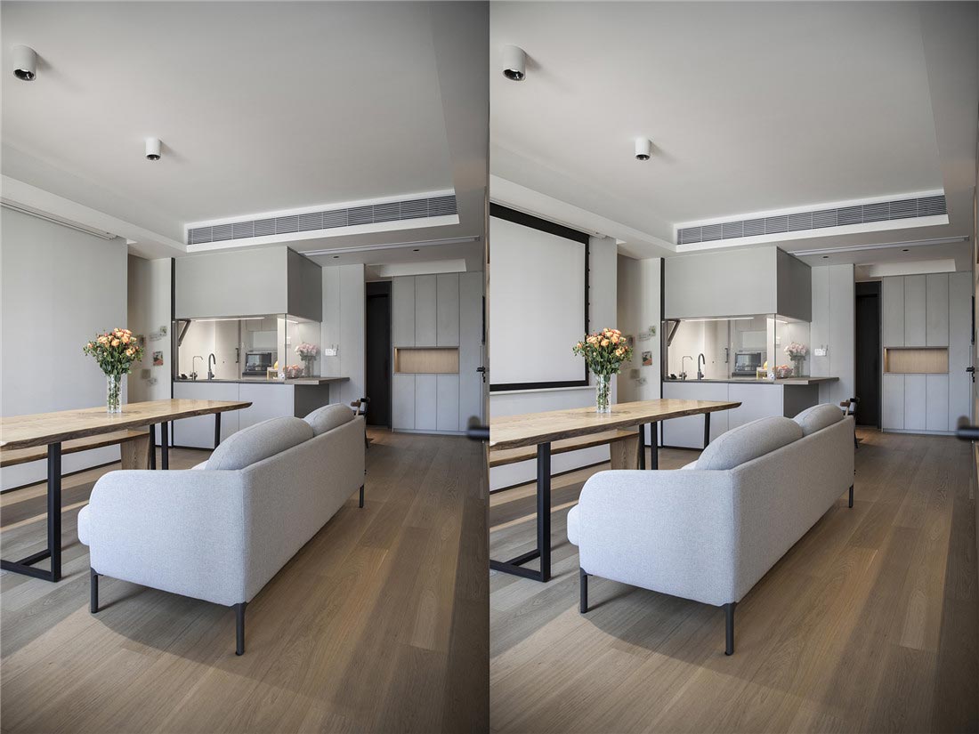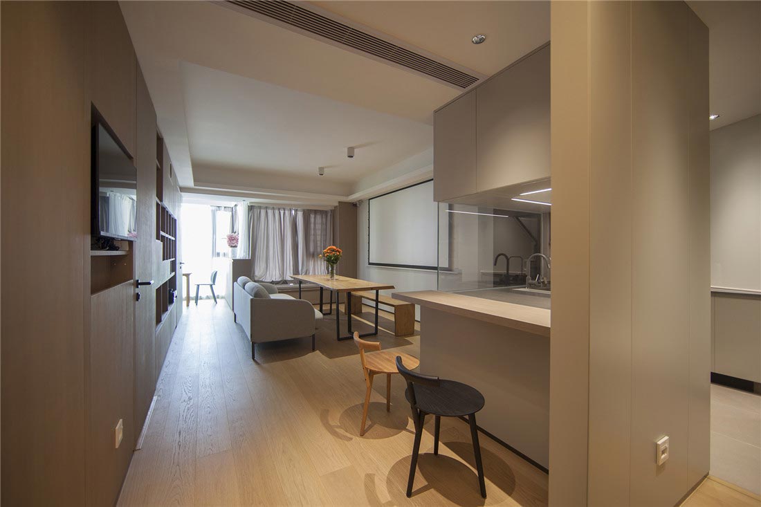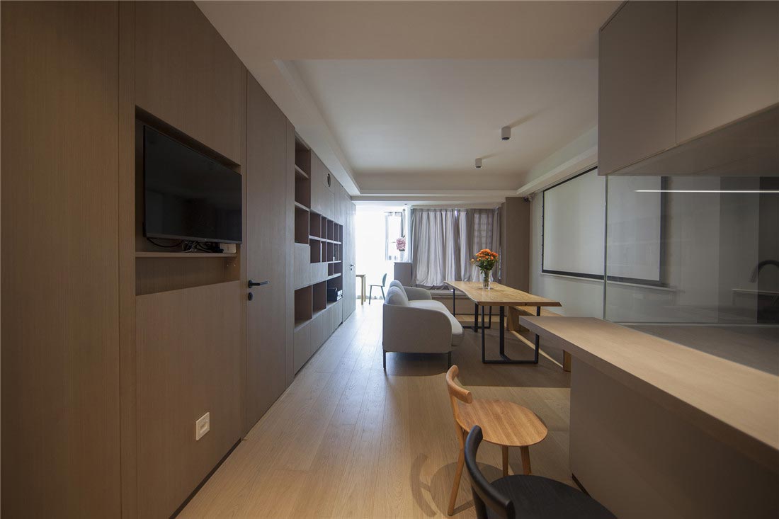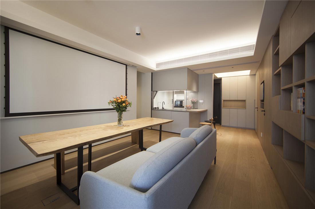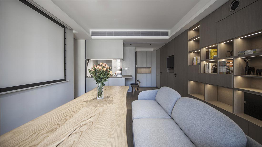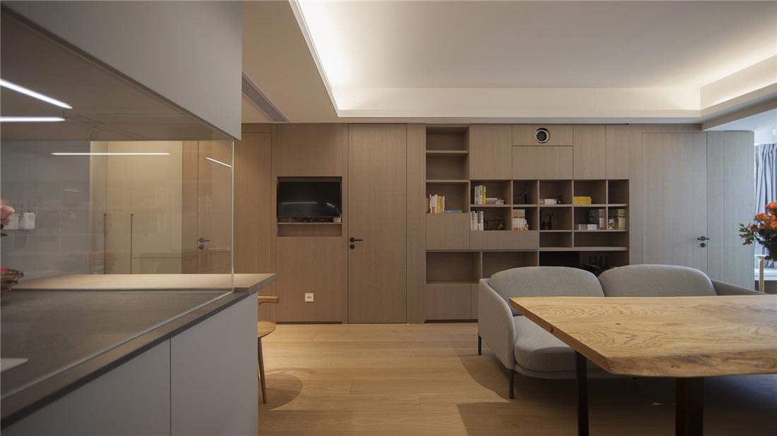 客厅以木纹的运用开启房屋的主要印象,大书柜、白色磁力板、长桌承载着多样的功能性,满足日常的用餐、亲子阅读、同学聚会。开放式布局营造整体环境的亲密互动关系,形成连贯的交流空间。
