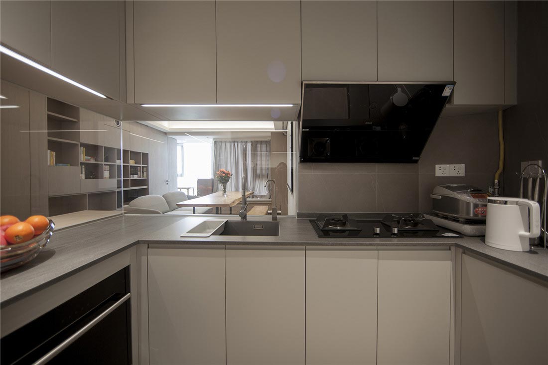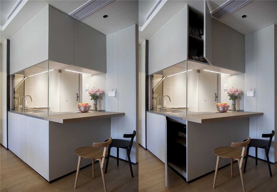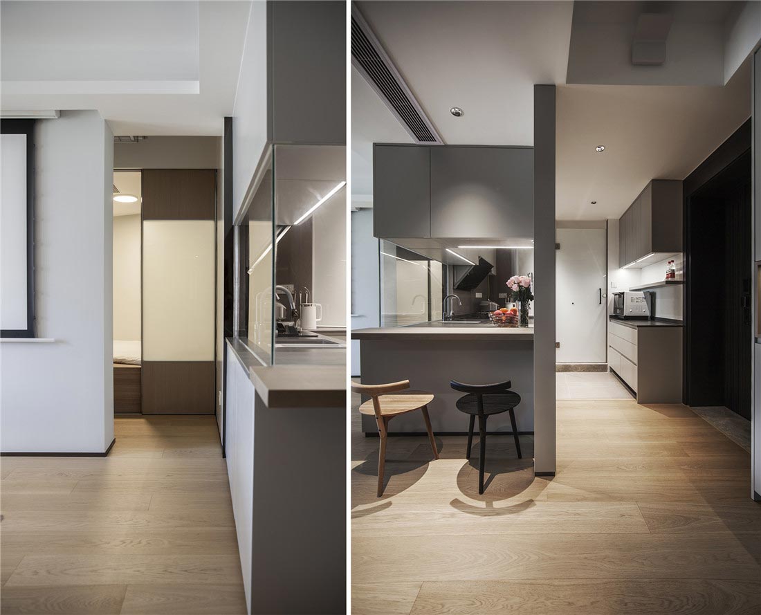 厨房与客厅的通透设计,增进与餐厅外的人交流,在厨房橱窗看出去,温婉亲密的格调慰藉心间。木纹墙体、大理石瓷砖以细腻的部分介入空间,体现细节的精致与丰盈,提点空间的活力与美学。