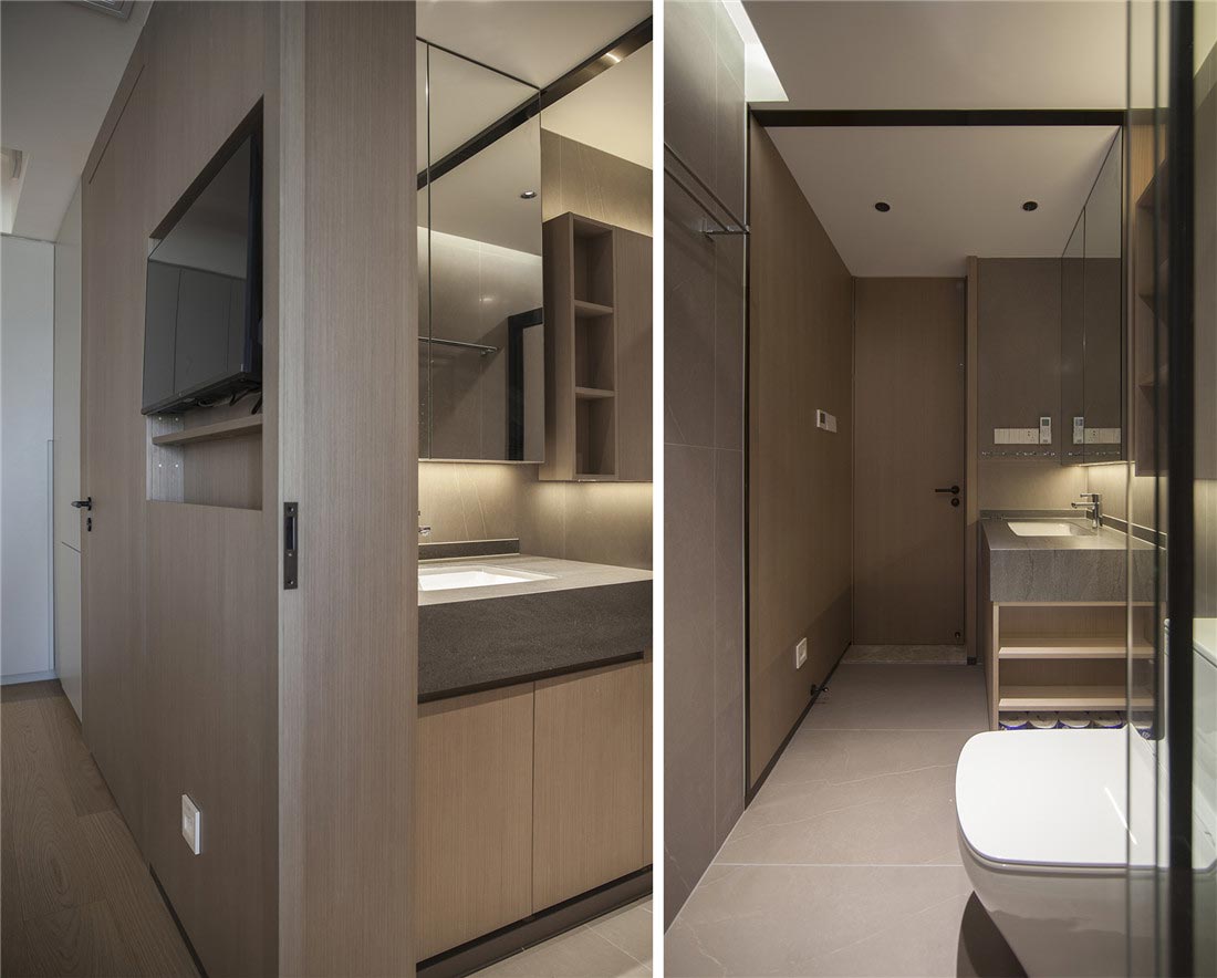 客厅一扇门进去就是浴室,使家具与空间融合的恰如其分,达到空间整体性的美观。选材方面,仍旧延续整体空间中木纹的元素,中灰大理石瓷砖奠定沉稳雅致的氛围,衔接与客厅的自然转场和过渡。