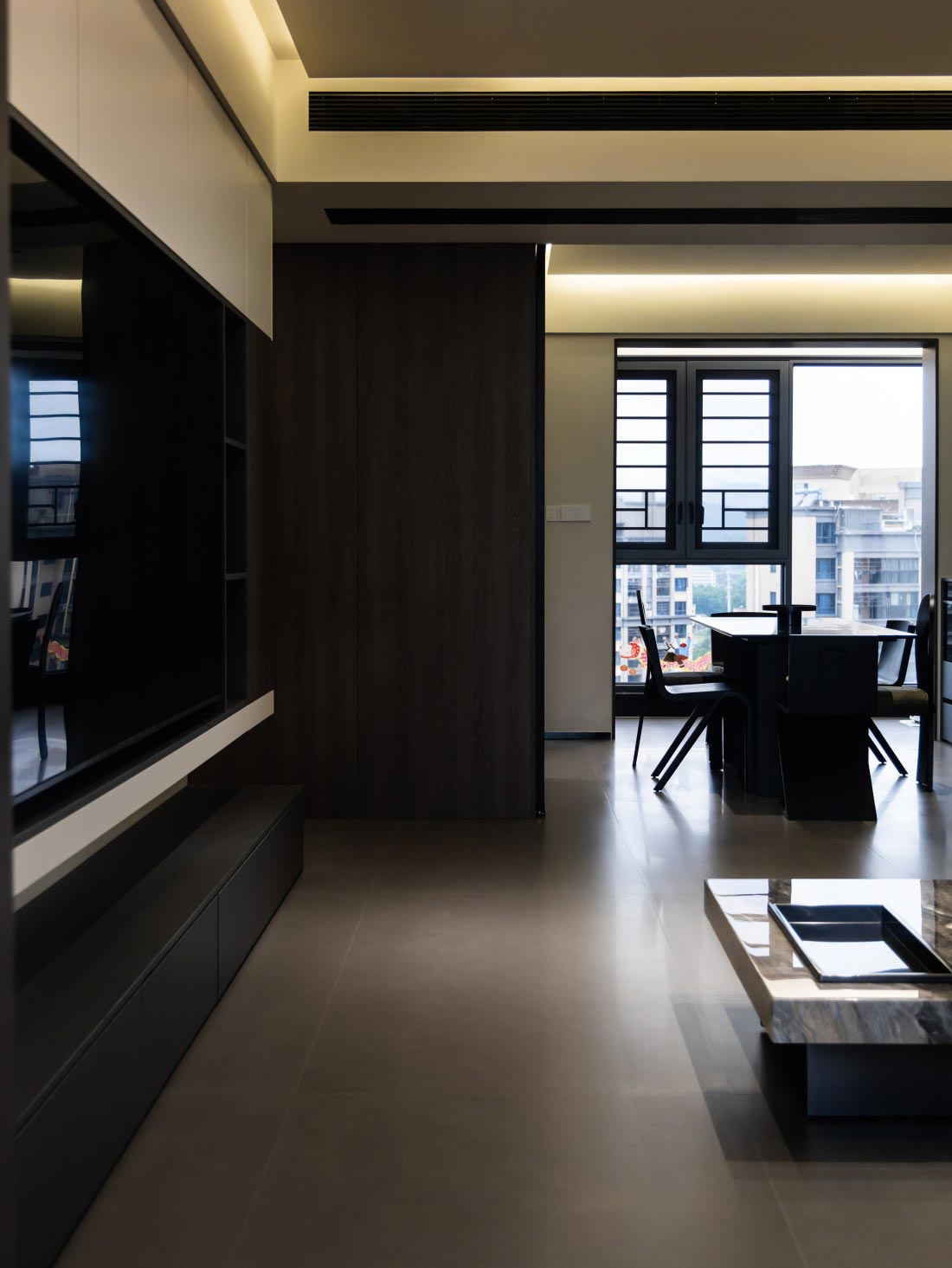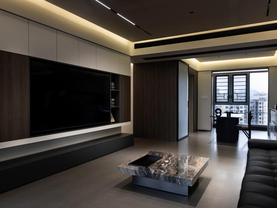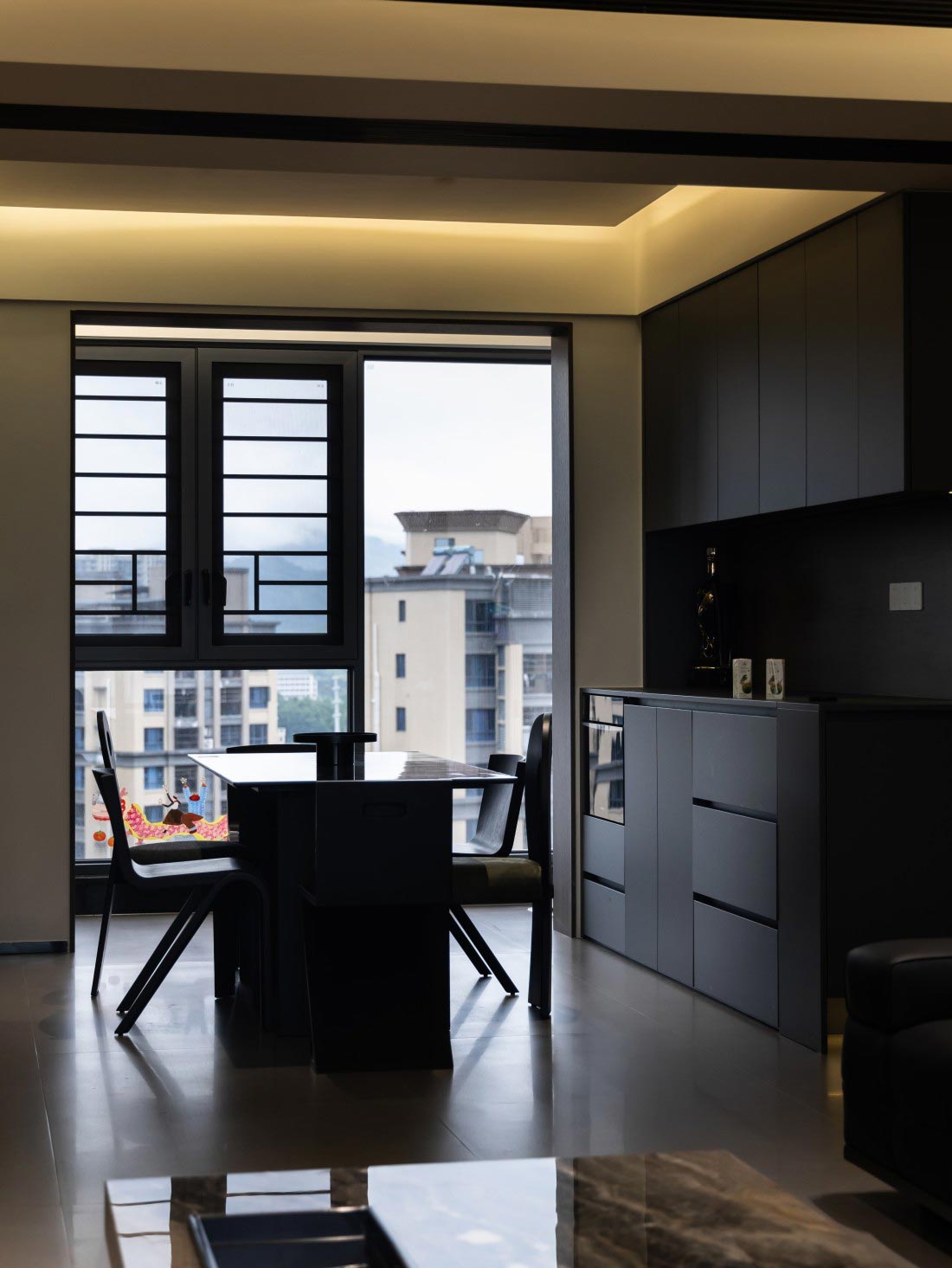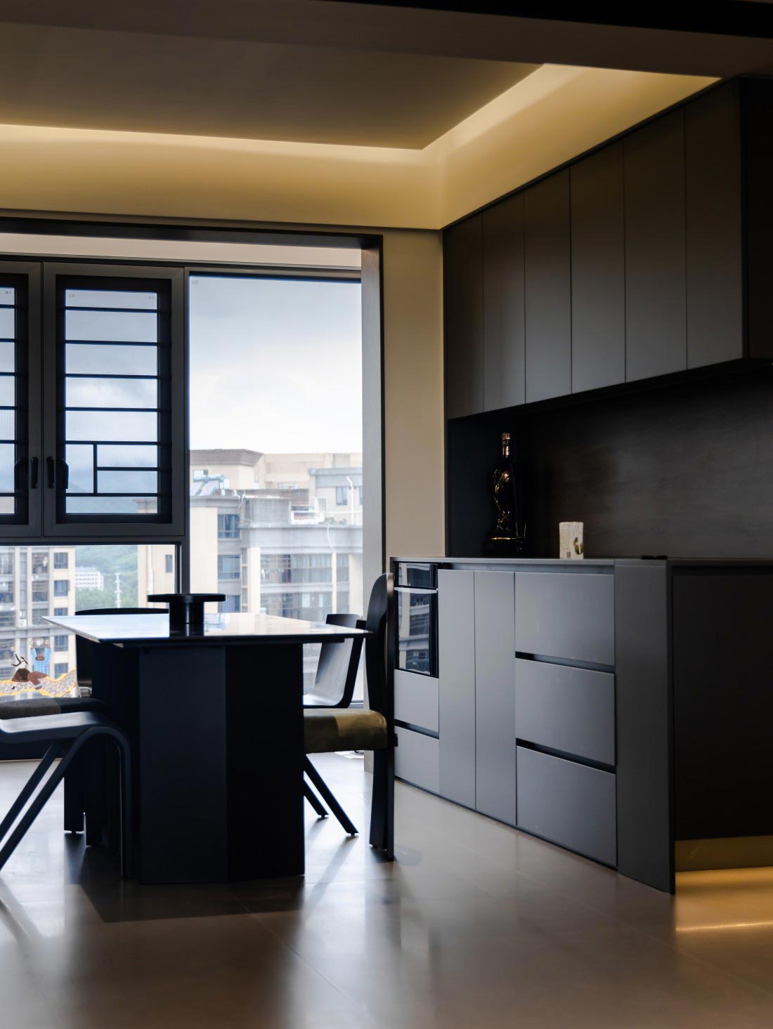 设计师把更多空间让渡给简约装饰,餐厅一体感黑色橱柜,满足收纳的同时也更具轻盈感,在暖光灯带的调和下摆脱沉闷尽显高级。
