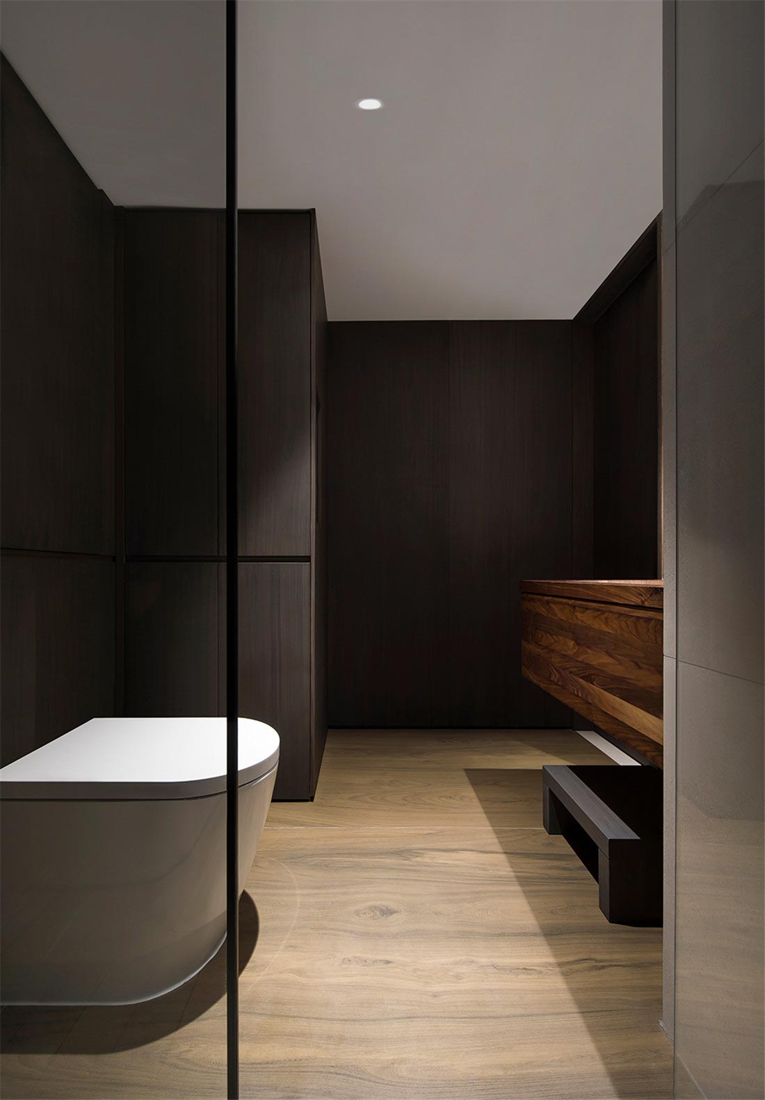 浴室延续了公共空间的简洁配色,温润的木纹瓷砖中和部分清冷,温暖人们的心灵。