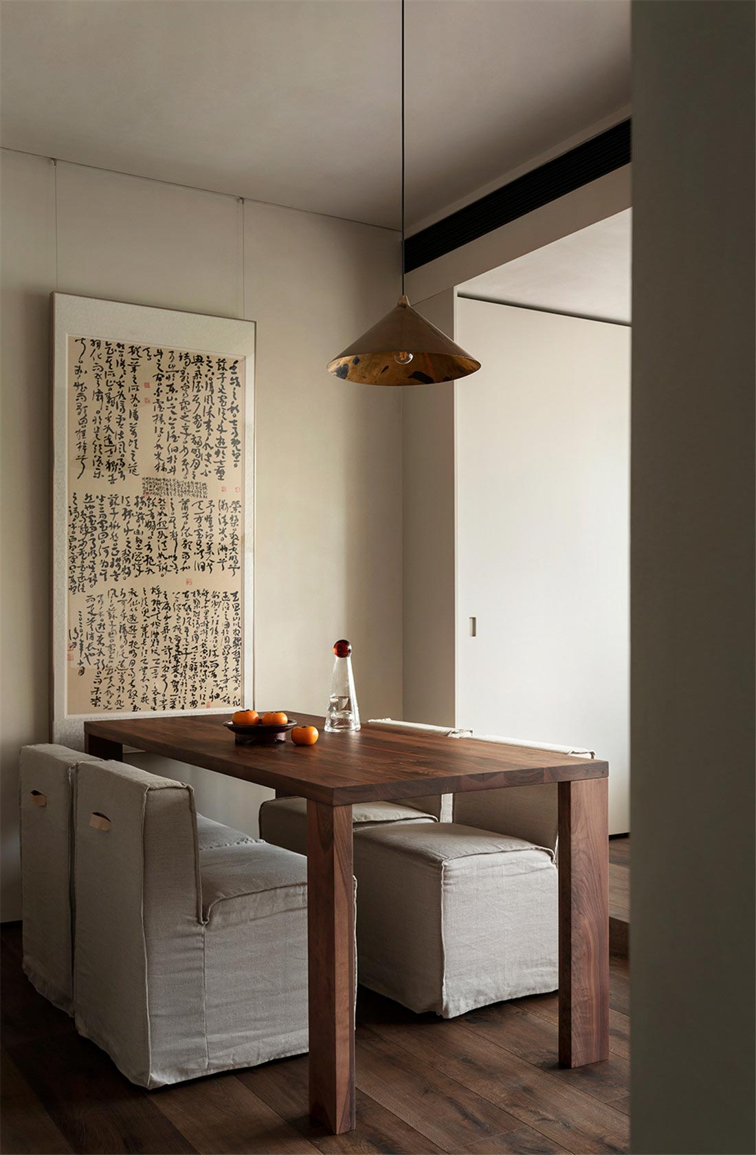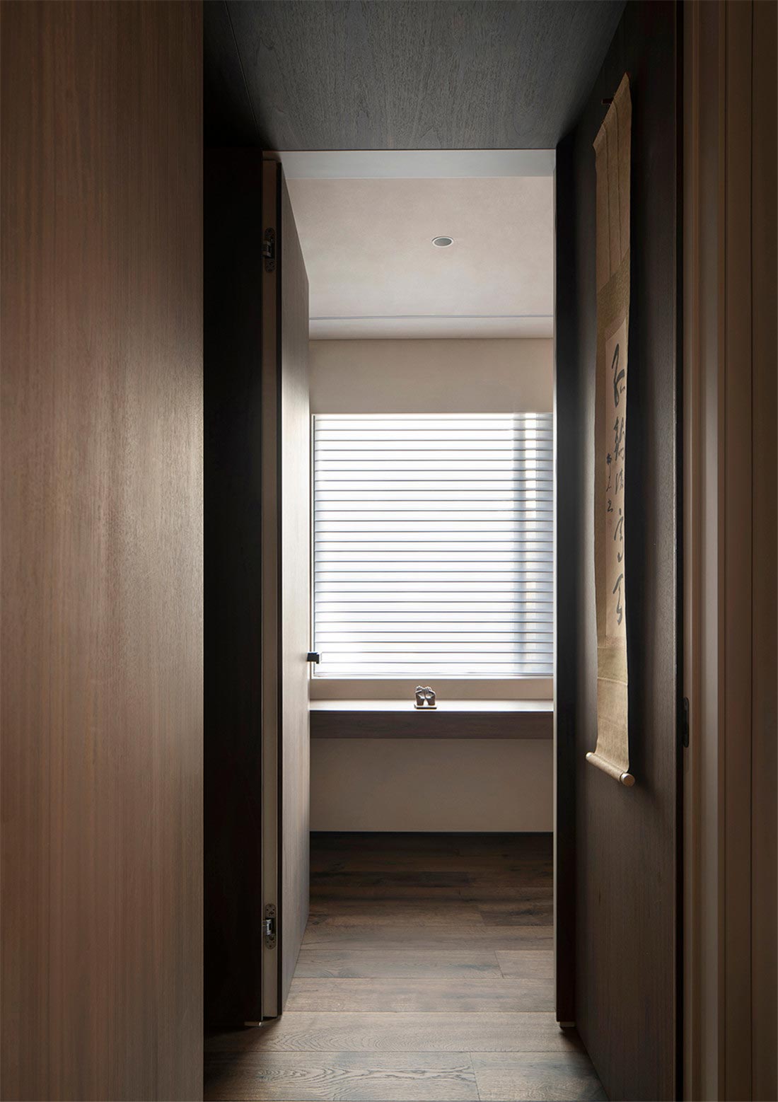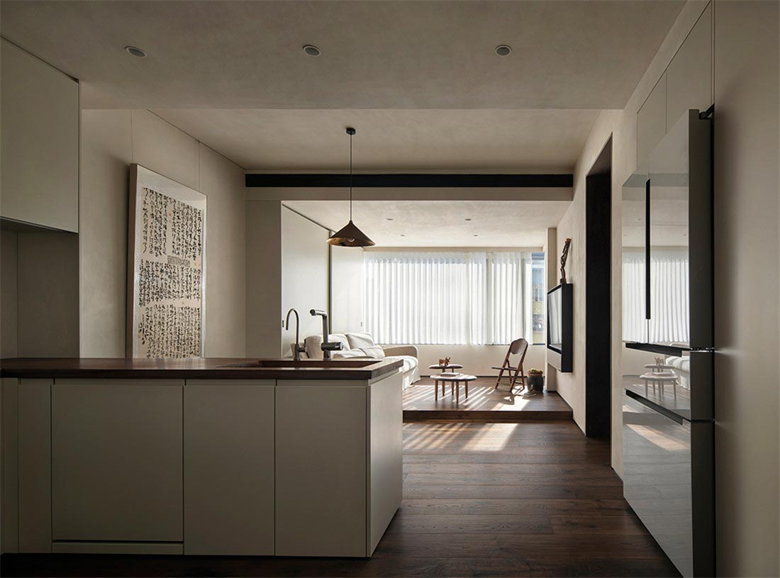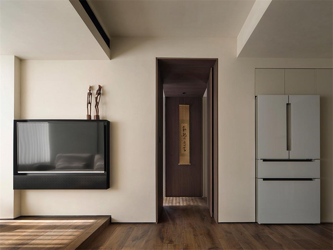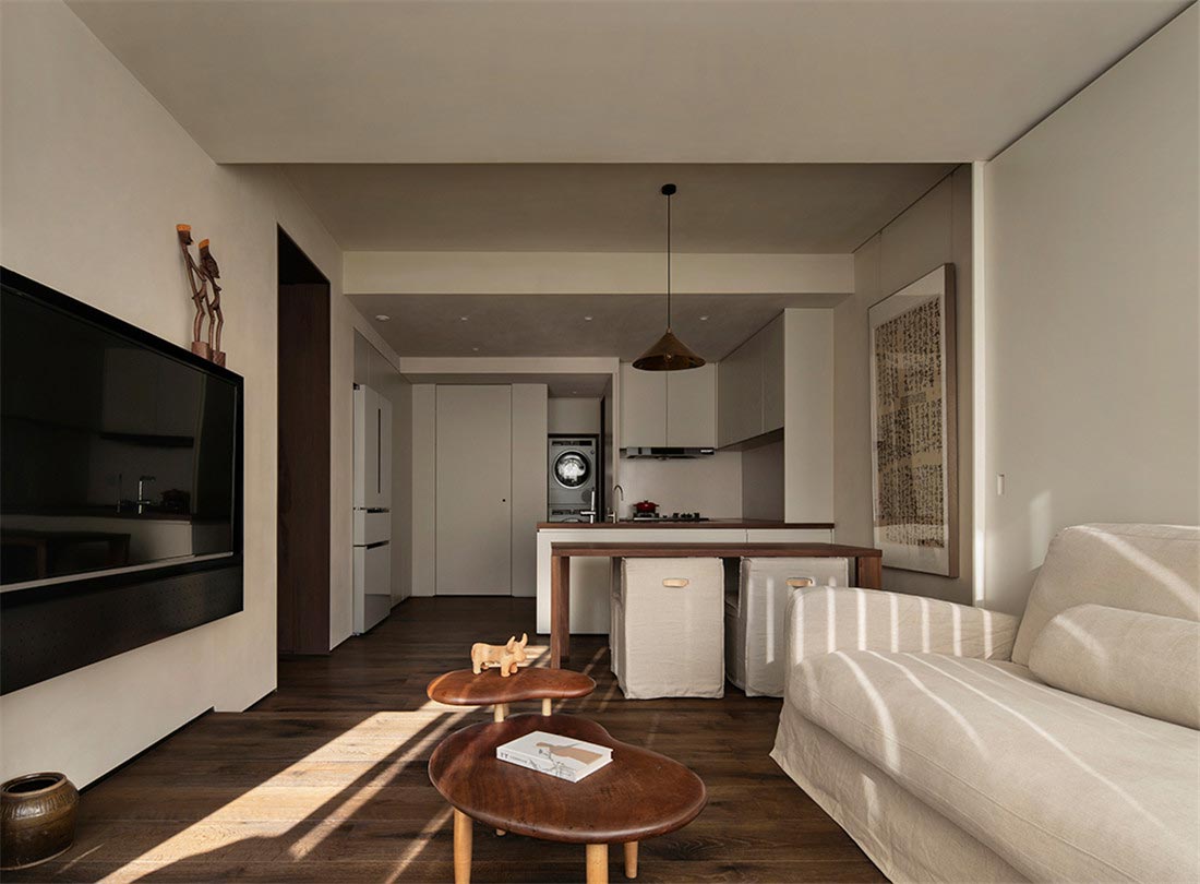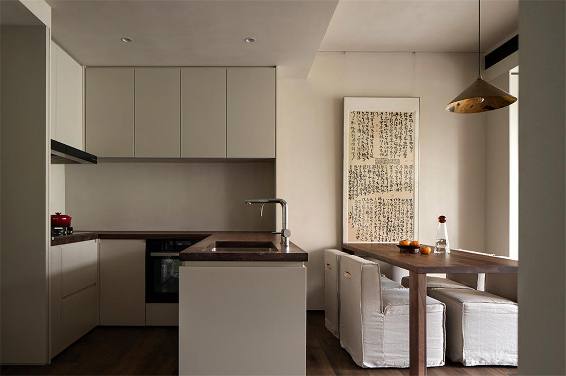 从客厅开始,我们就注意到屋主对家装和家具选择都有朴素的风格的偏好。被胡桃木包裹着的走廊,阳光透过百叶窗帘,光影摇曳,定格温暖。一幅日本回流草书茶挂,恒守对温、诗、意的向往,在日常感知自然、艺术、美学的浸润。