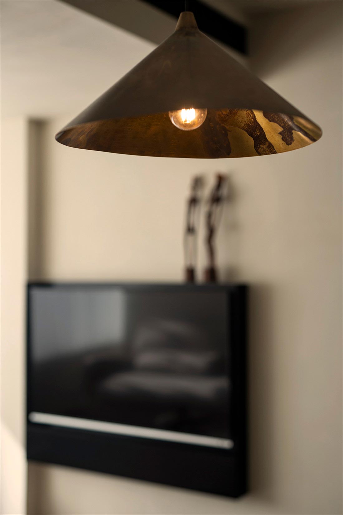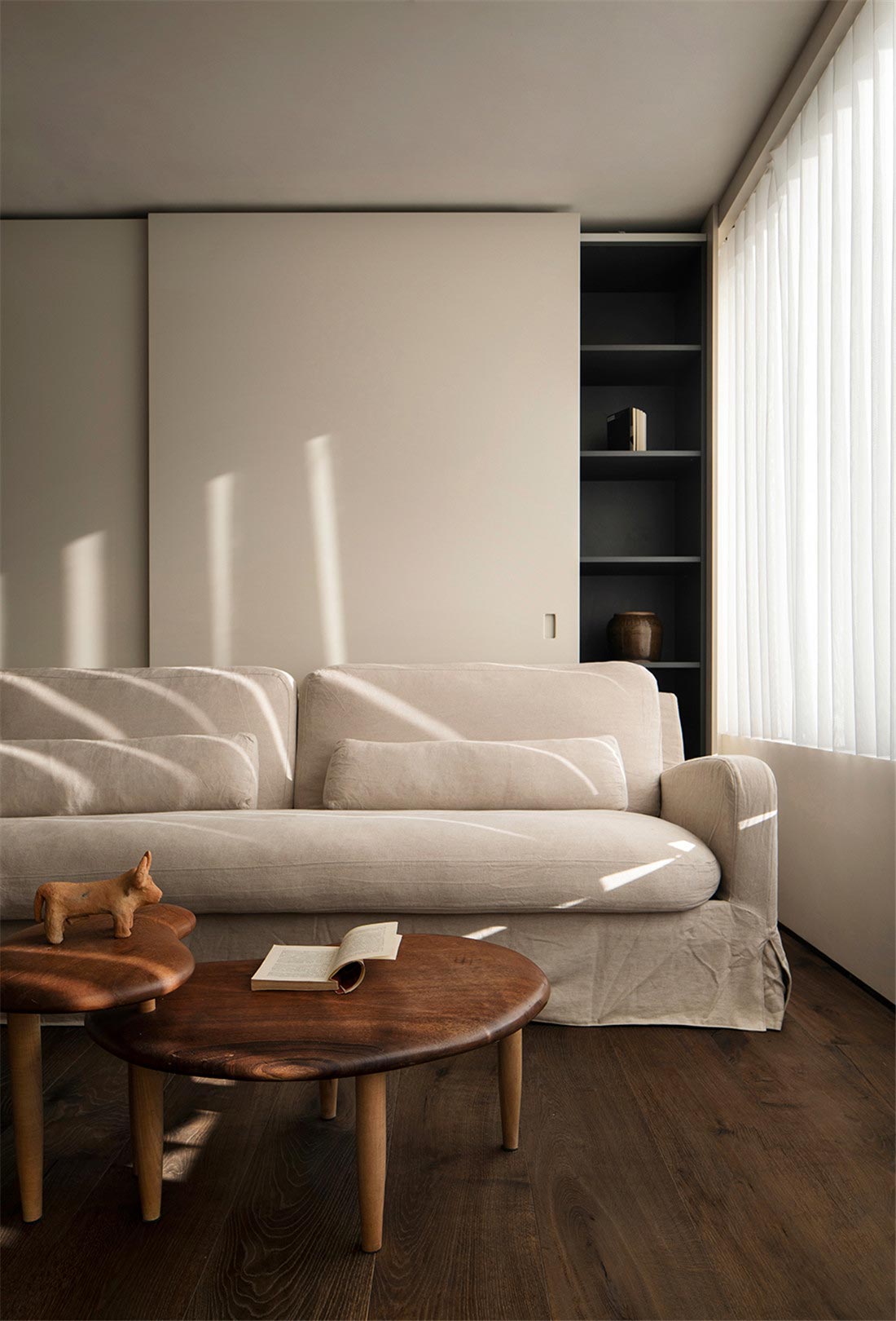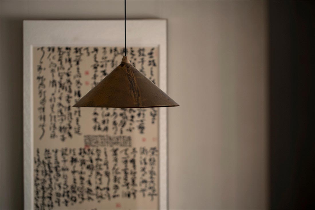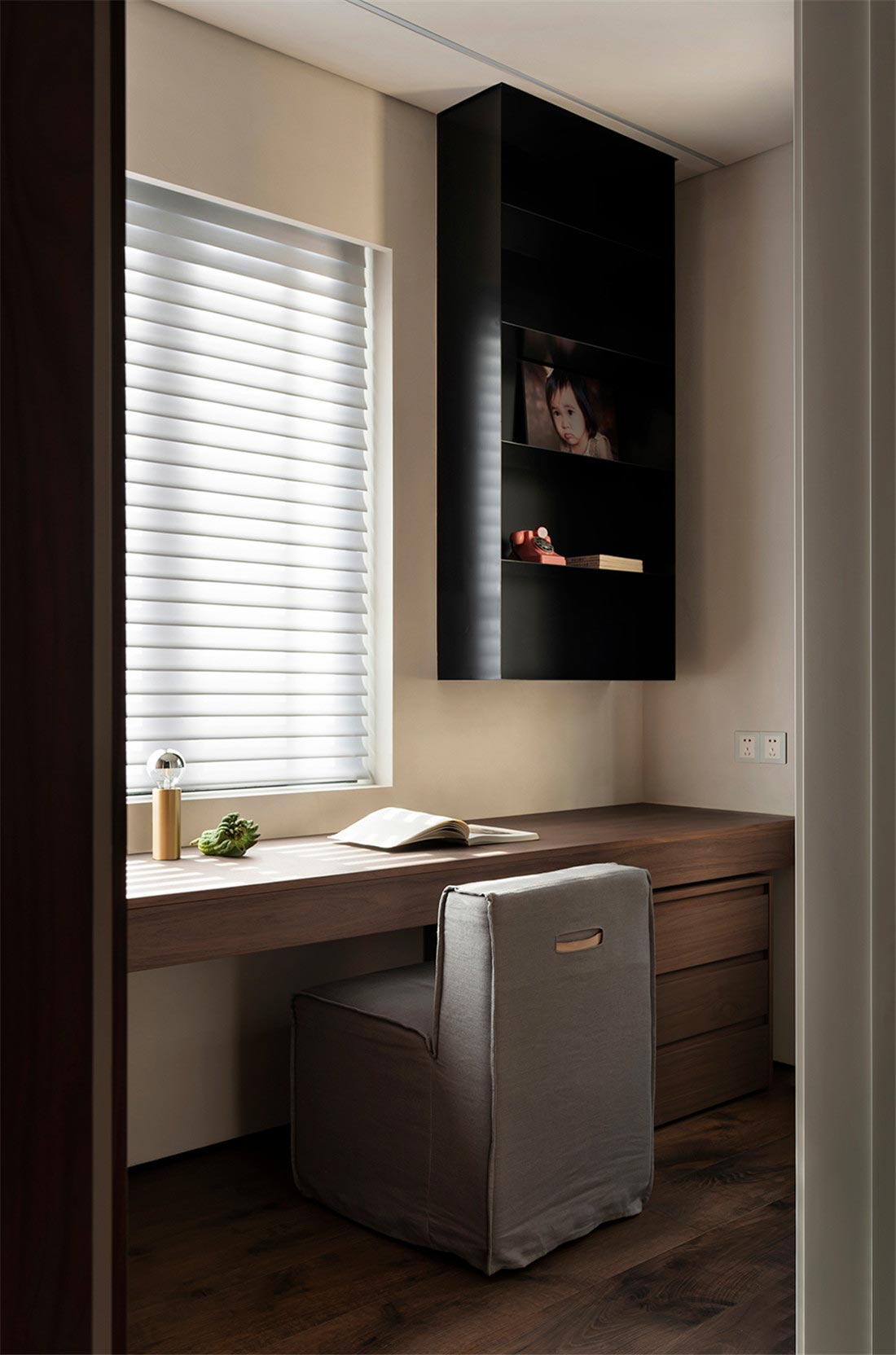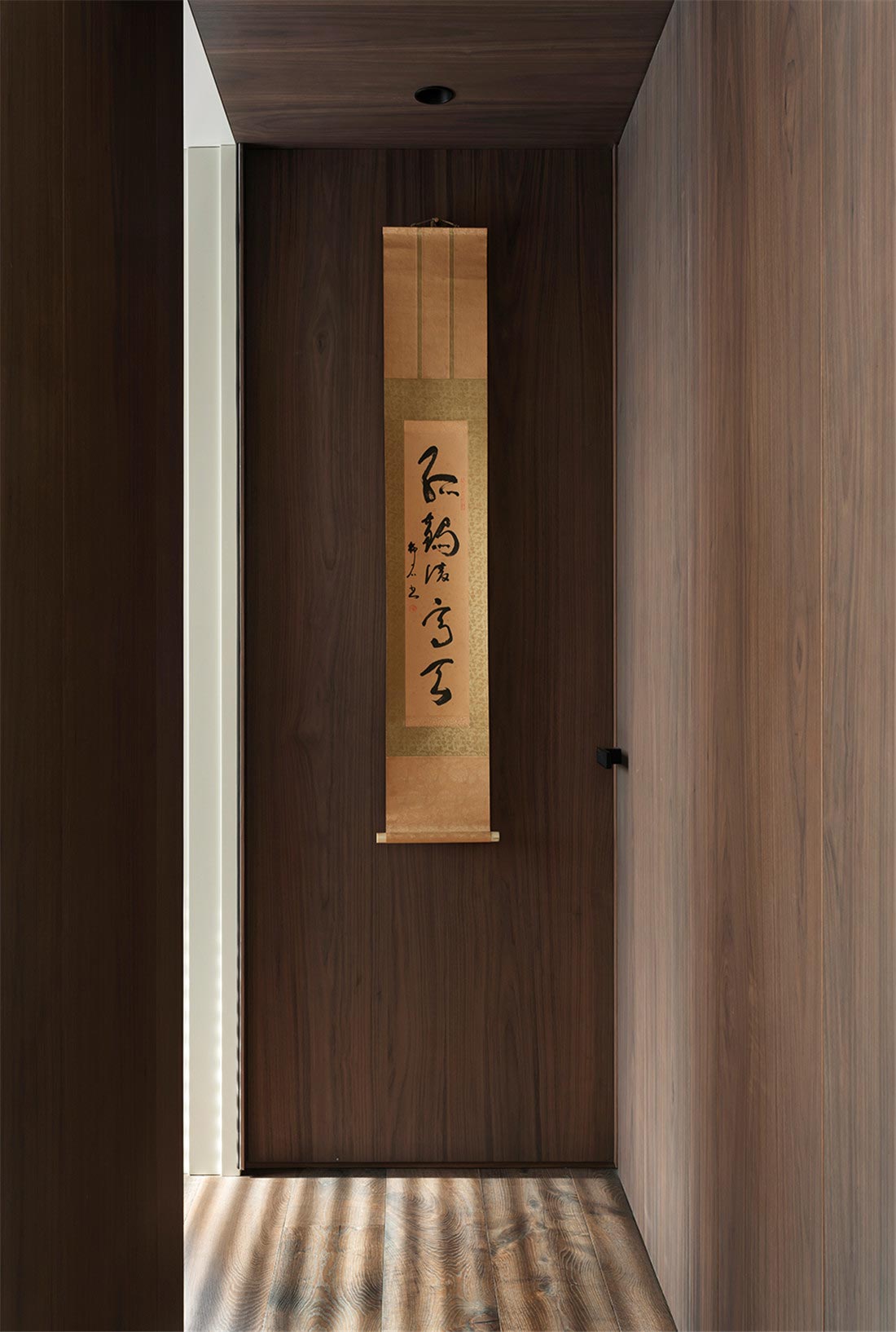 从客厅开始,我们就注意到屋主对家装和家具选择都有朴素的风格的偏好。被胡桃木包裹着的走廊,阳光透过百叶窗帘,光影摇曳,定格温暖。一幅日本回流草书茶挂,恒守对温、诗、意的向往,在日常感知自然、艺术、美学的浸润。