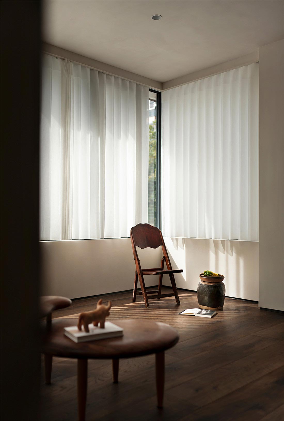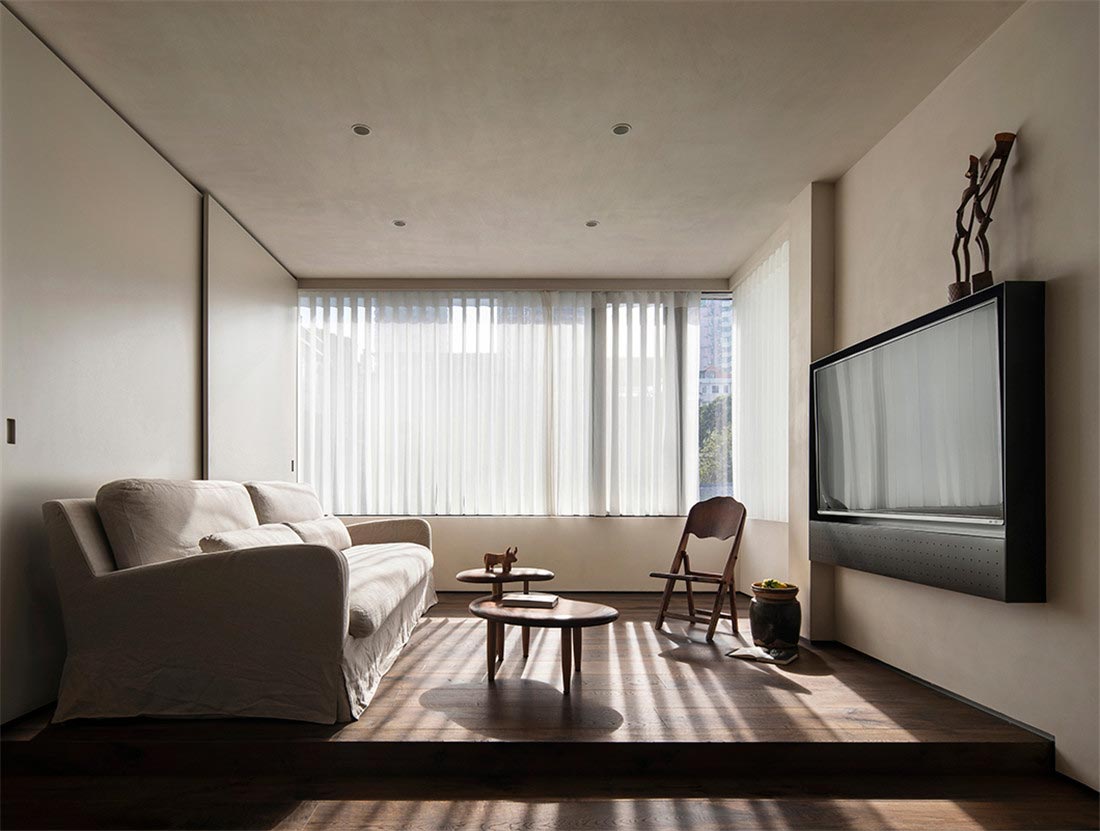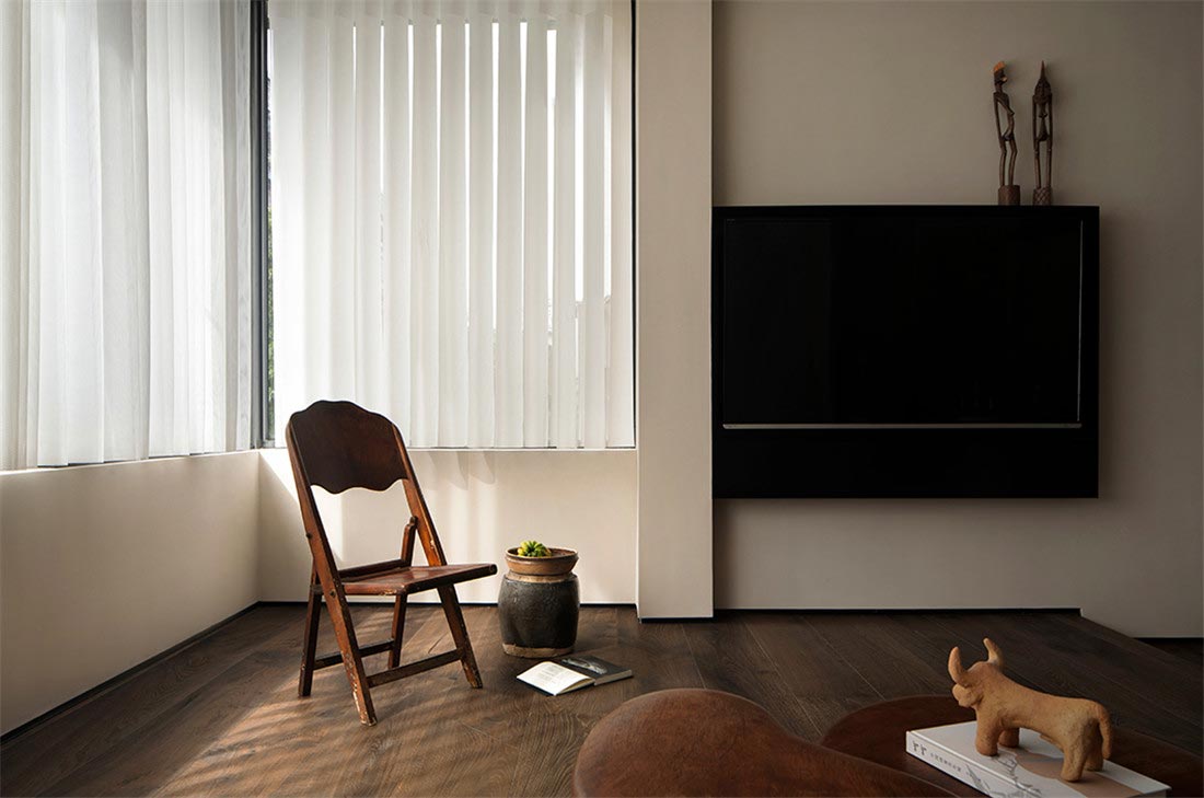 客厅边侧大窗引入自然光线,清晨阳光明朗温暖,窗帘随着光影变化给屋内增加不少意趣。整个明朗朴素的感受,不动声色地让你放慢脚步,情绪被渐渐放慢,和空间的一桌一椅子共呼吸。
