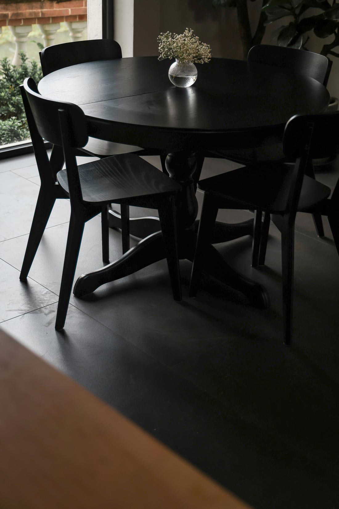 极简轻法式不是各类元素堆砌,而是色彩、形态与材质之间的平衡与糅合,并将这部分元素进行放大和延伸,做到彼此呼应:原木色系家具与炭黑色SRA细石粒瓷砖的搭配,色彩的呼应,把更多地“可能性”留给空间氛围来发挥。