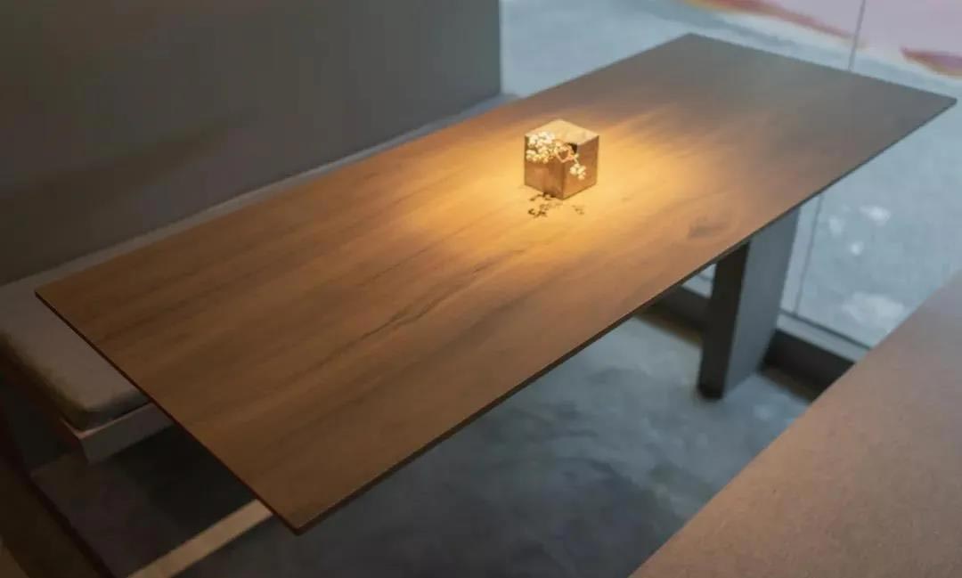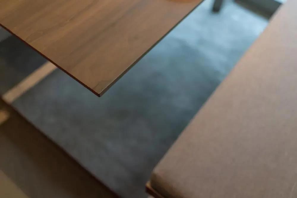 “所以我用了天古的木纹产品去做,而且四周是没有加边框的,直接用一整块极薄的木纹瓷砖去打造。”